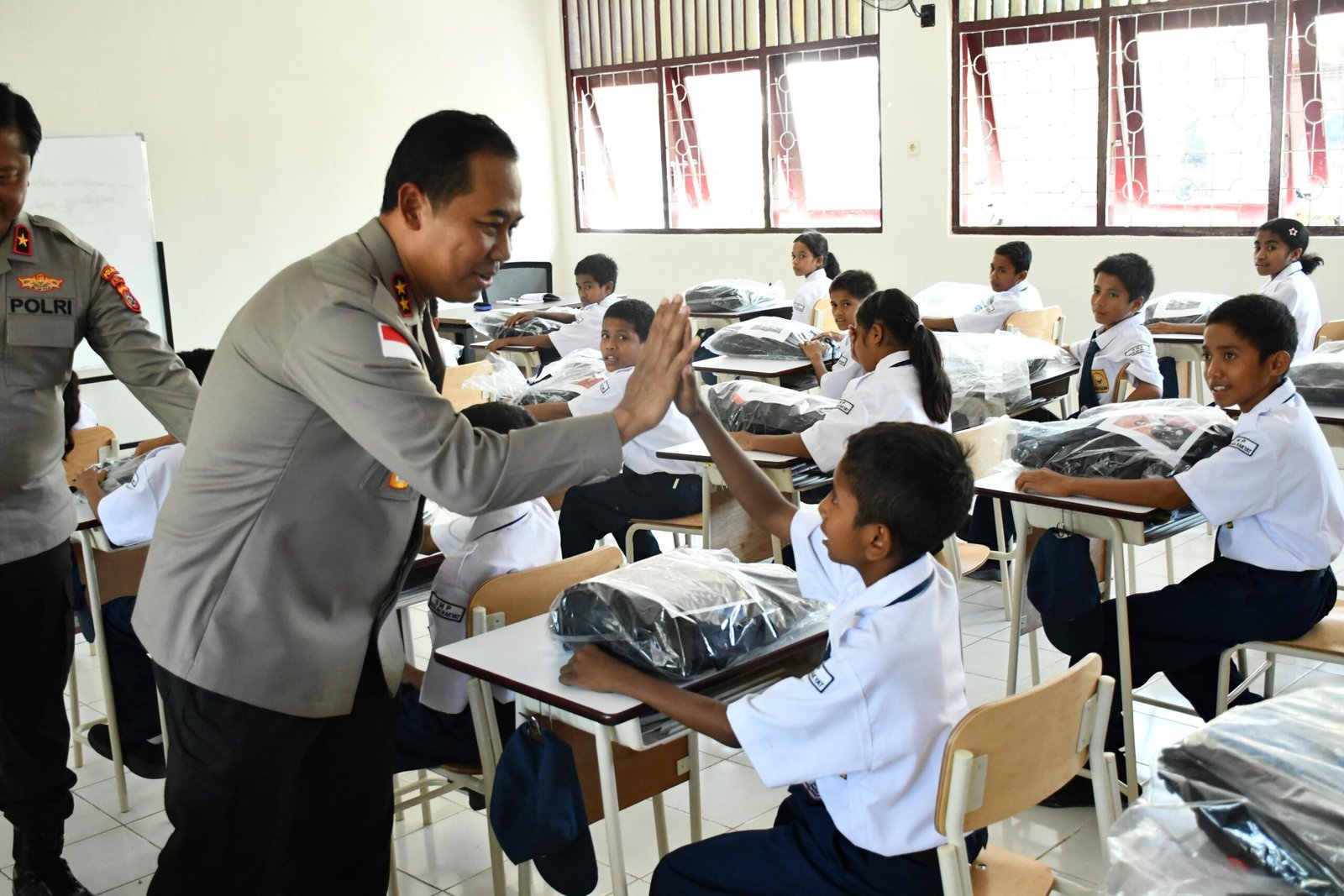 “Kami membawa oleh-oleh untuk kalian: tas baru, alat tulis, dan kaos olahraga. Kalian harus rajin berolahraga, supaya sehat, tumbuh tinggi, dan semakin pintar,” kata Kapolda yang disambut sorak gembira para siswa.